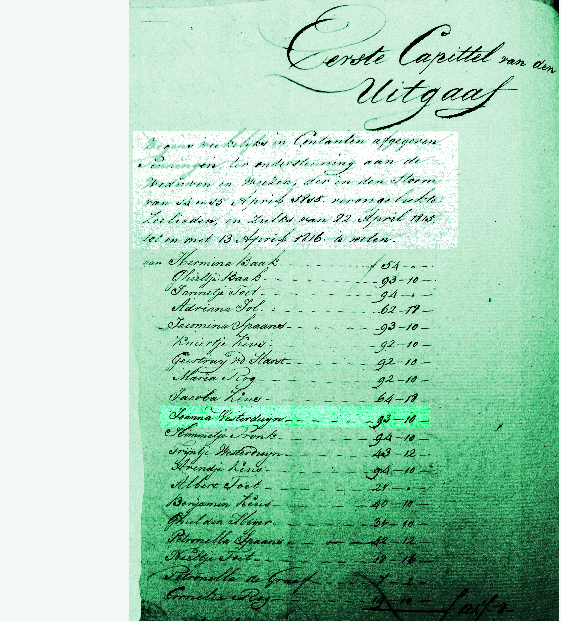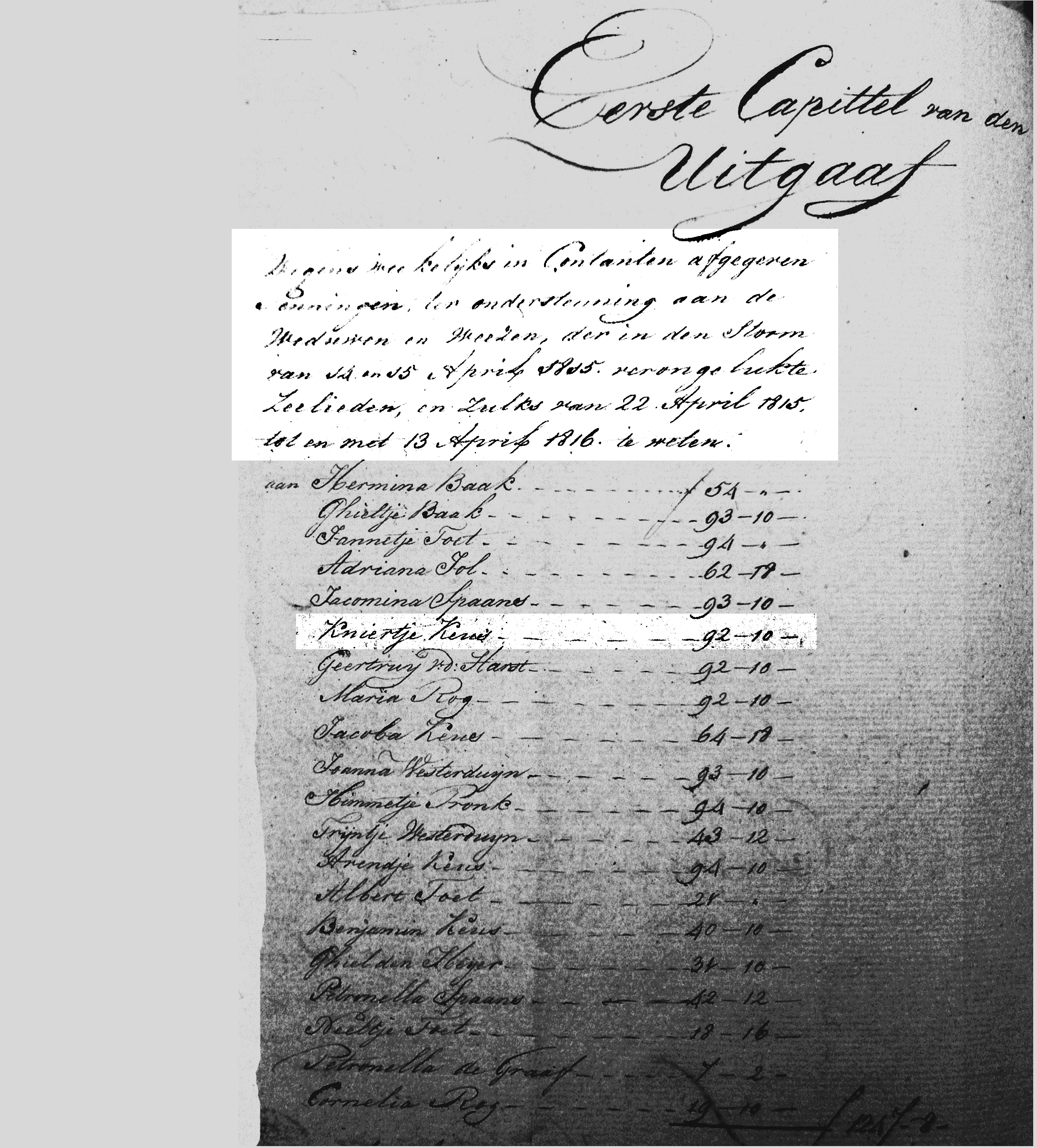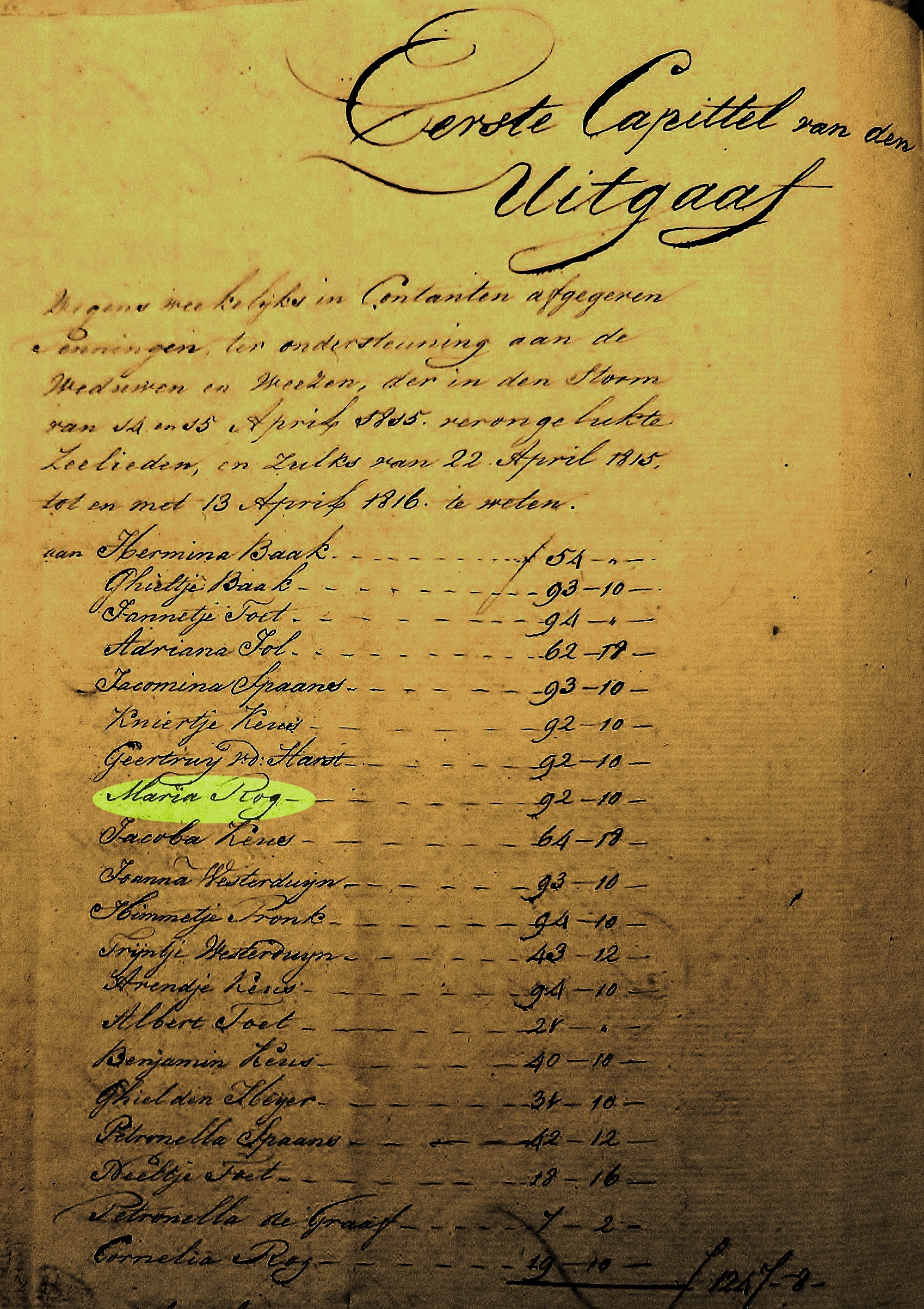 Slechts aan de hand van een lijst van ondersteunde weduwen- en wezen kon d.m.v. genealogisch onderzoek de verdronken echtgenoten of zonen worden achterhaald. Met dank aan Martin Spaans Azn. - voorzitter van de Historische en Genealogische Vereniging Scheveningen- die een groot deel van dit genealogisch onderzoek voor zijn rekening nam. Daarbij kon met behulp van de doopregisters tevens de juiste leeftijd en schrijfwijze van de namen worden achterhaald.