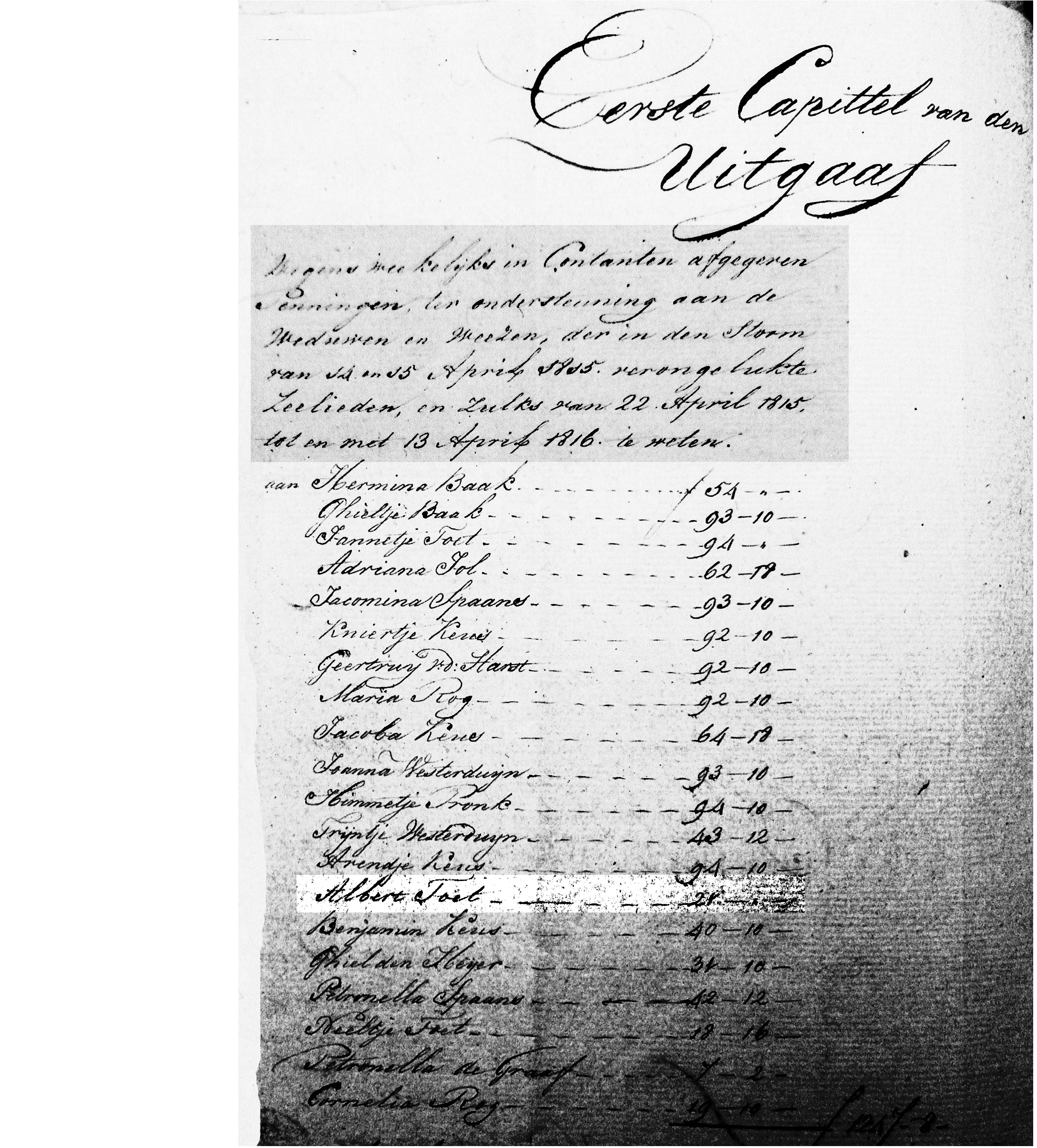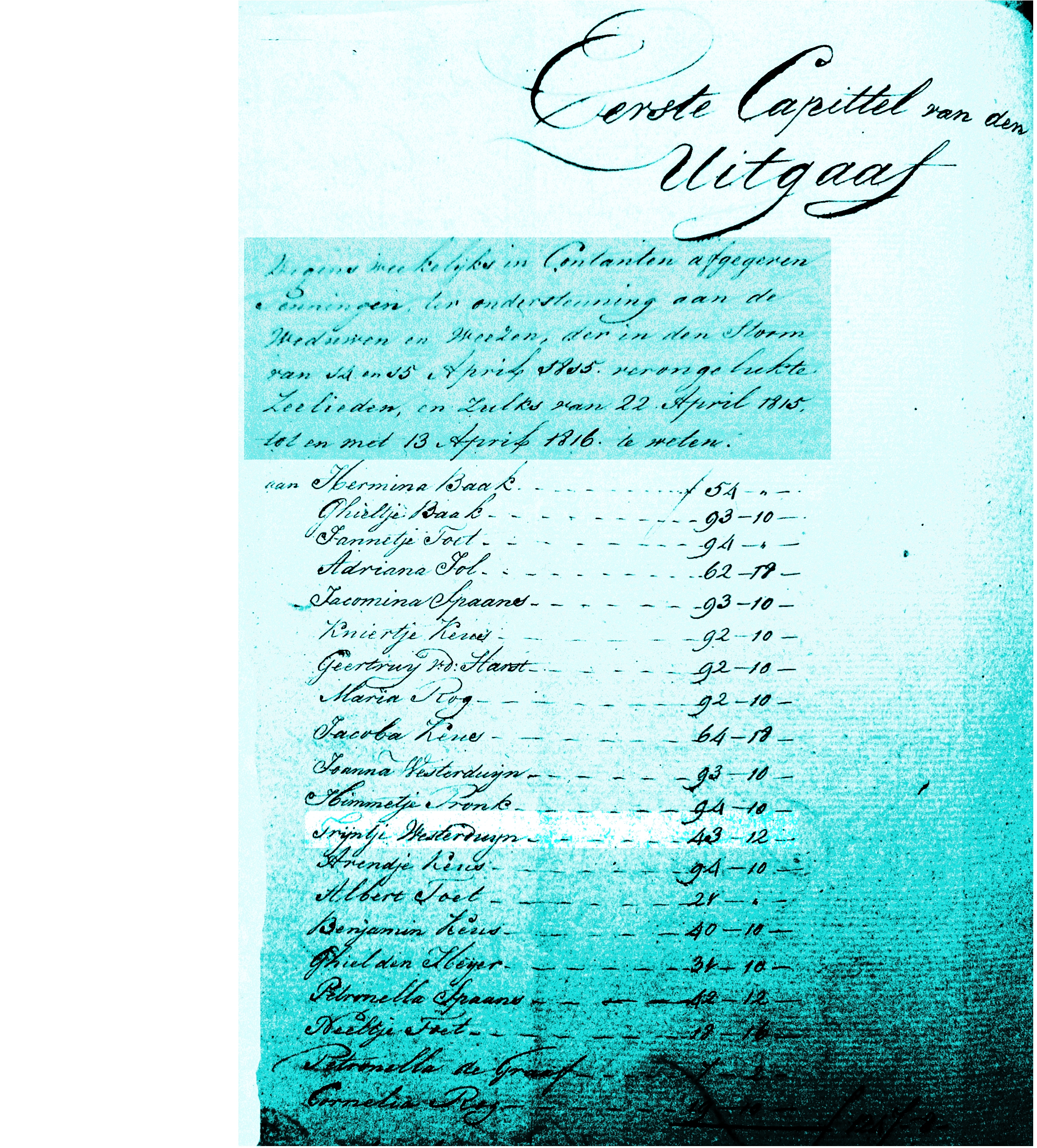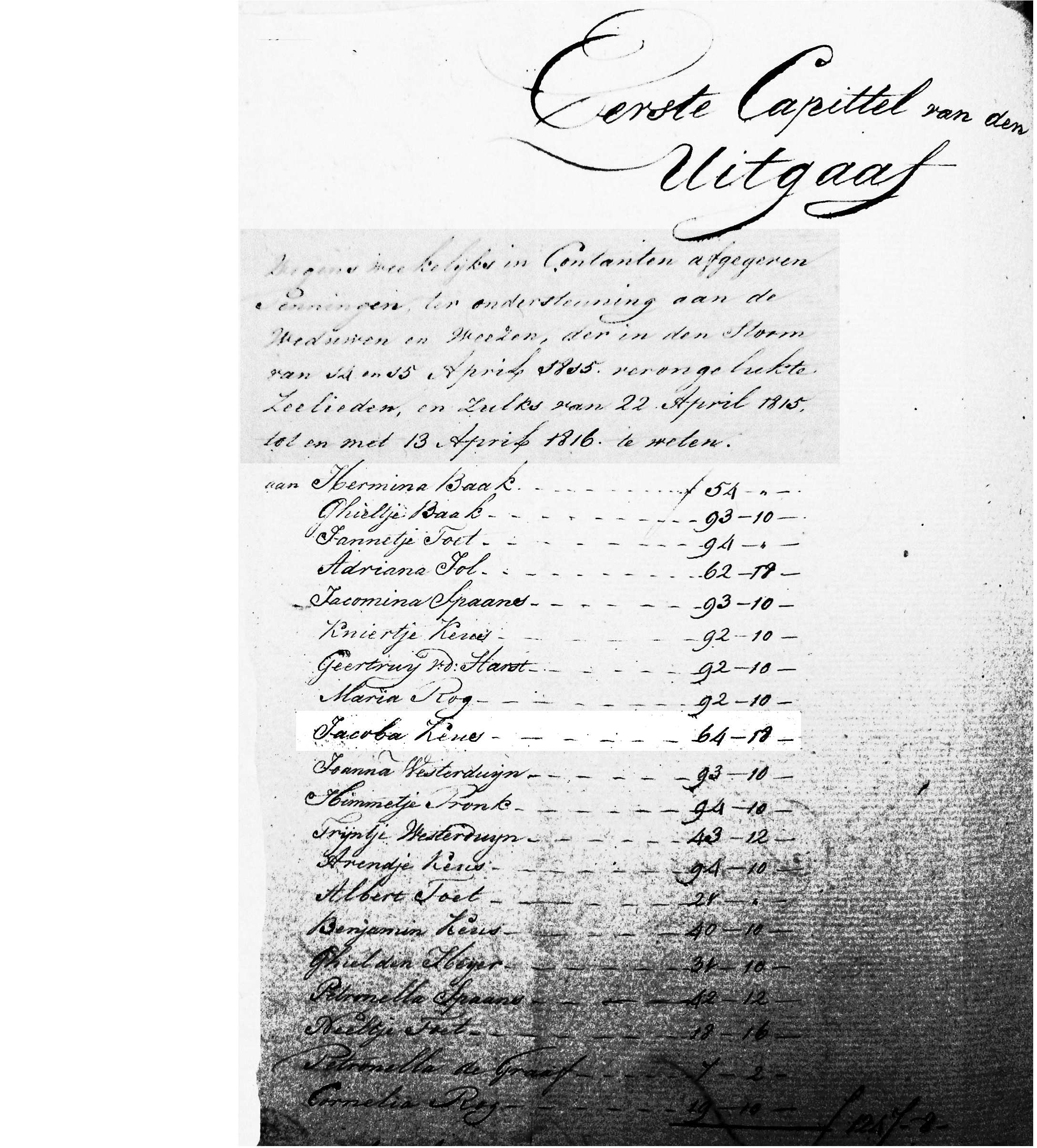 Slechts aan de hand van een lijst van ondersteunde weduwen- en wezen kon d.m.v. genealogisch onderzoek de verdronken echtgenoten of zonen worden achterhaald. Met dank aan Martin Spaans Azn. - voorzitter van de Historische en Genealogische Vereniging Scheveningen- die een groot deel van dit genealogisch onderzoek voor zijn rekening nam. Daarbij kon met behulp van de doopregisters tevens de juiste leeftijd en schrijfwijze van de namen worden achterhaald.