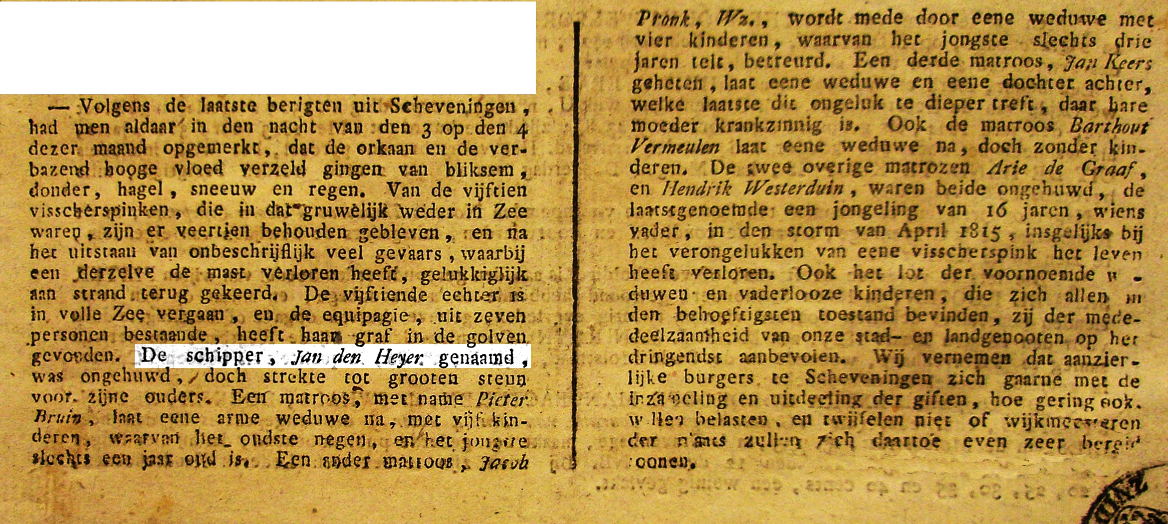 * Hendrik Westerduin: zijn vader Johannes Westerduin kwam om in april 1815 op een onbekende pink.