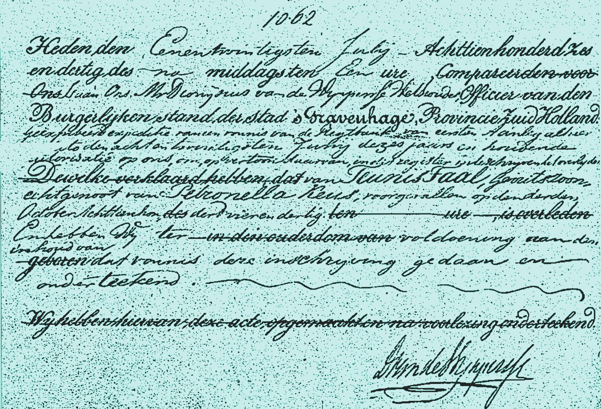 Op 7 maart 1851 doet stuurman Arie Pronk aangifte van het op zee overlijden van matroos Dirk den Heijer.
