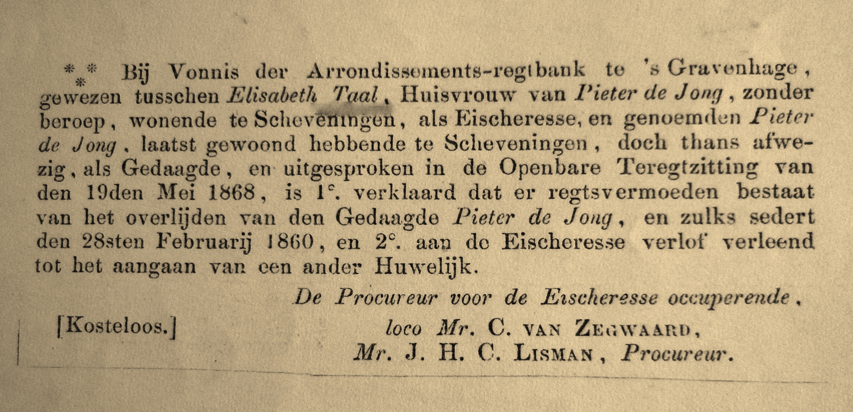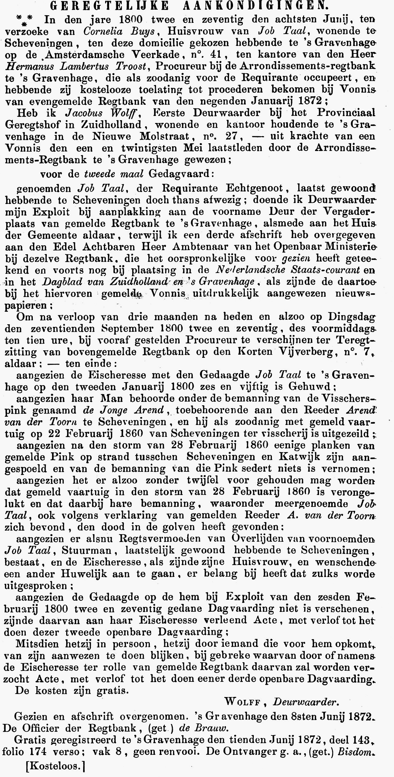 Op 23 februari was de pink De Jonge Arend van reder Arend van der Toorn met als stuurman Job Taal vanaf het Scheveningse strand naar zee vertrokken voor de visserij. Op de 27e brak de storm los. Enkele in de nabijheid vissende pinken, die de Jonge Arend eerder nog bij daglicht hadden gezien, zagen de ochtend van de 28e nog slechts enkele voorwerpen drijven die van de Jonge Arend afkomstig moesten zijn.
