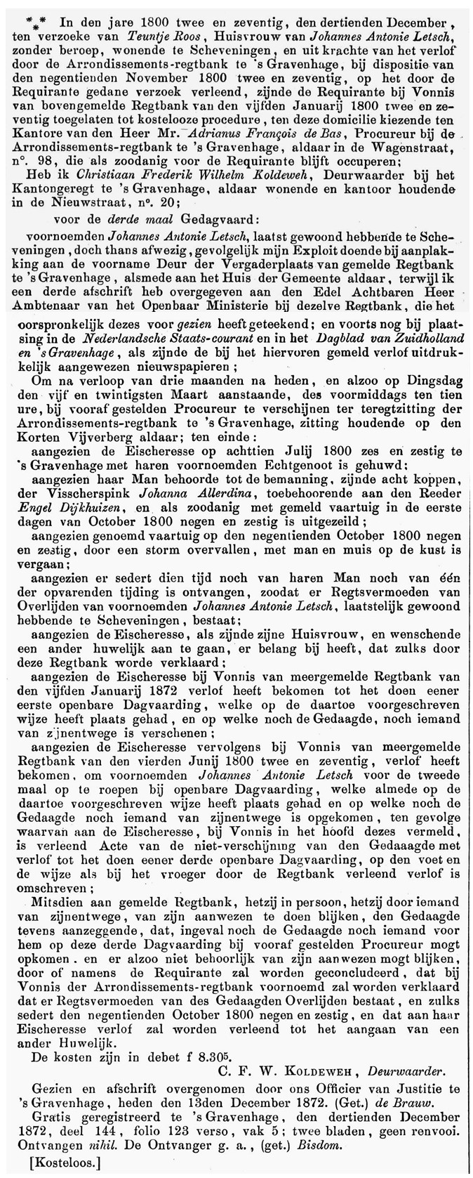 Op 5 oktober was de bomschuit voor de haringvisserij van Scheveningen vertrokken. Op 26 oktober kwam er een bericht van Noordwijk aan/zee dat de schuit zonder volk en als wrak was aangespoeld. Later bleken er toch nog twee lijken zich in het wrak te bevinden. De lijken waren in een staat dat zij niet meer naar Scheveningen konden worden vervoerd en werden vervolgens te Noordwijk begraven.