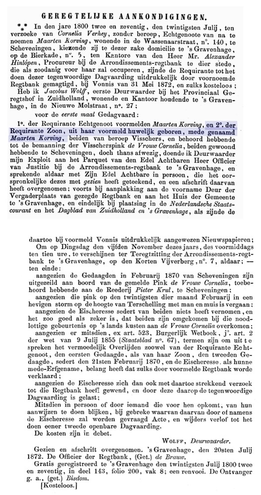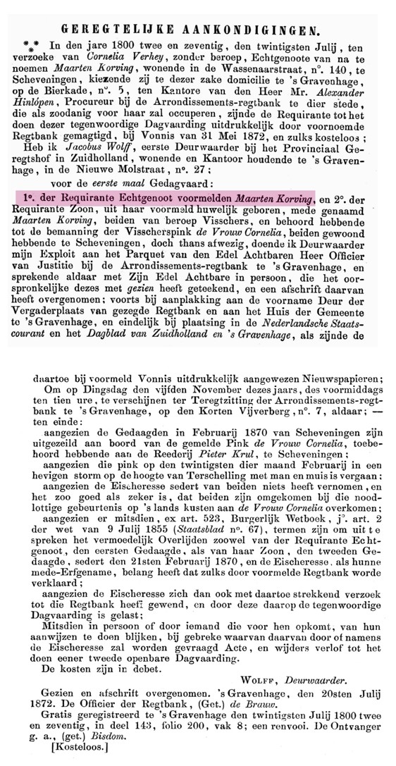 Rond 22 februari kwam er van Vlieland een telegram dat er twee Scheveningse pinken tijdens slecht weer met het aanlopen van de haven van Oost - Vlieland waren omgeslagen. De pink spoelde op het strand van Vlieland aan, maar lichamen werden er in het wrak niet meer aangetroffen.