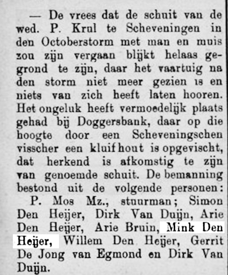 Op 28 september was de schuit naar zee vertrokken. Maar na de storm van 14 oktober verkeerde men half november in grote onzekerheid over het lot van de bomschuit ‘Toevallig.’ Rond 20 november werd met zekerheid vernomen dat de schuit met man en muis was vergaan. Rond tien december spoelde ten zuiden van het dorp Noordwijk een roer aan welk naar men vermoedde afkomstig te zijn van een Scheveningse bomschuit.