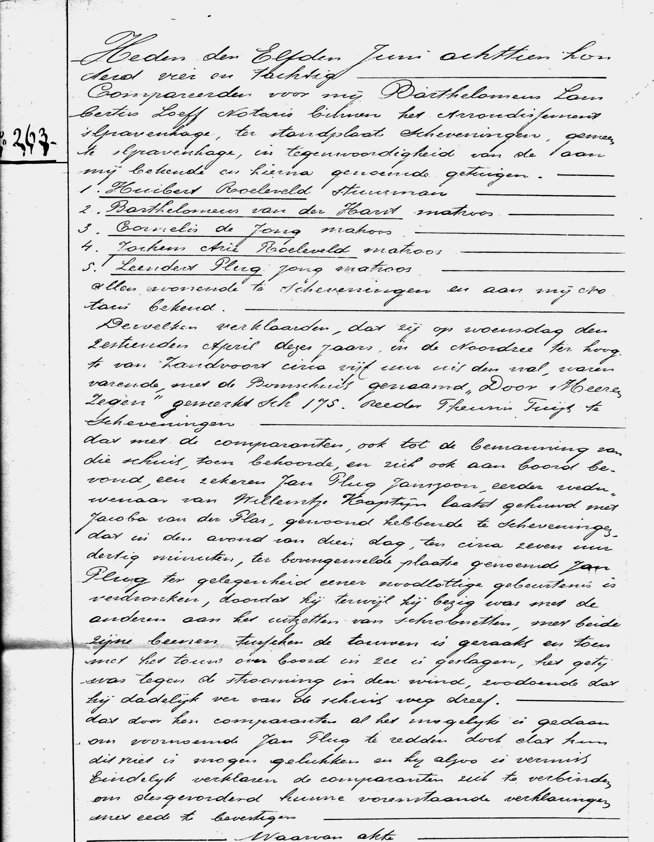 Op de schuit werd tijdens het uitzetten van de netten matroos Jan Plug overboord getrokken en verdronk. Jan Plug was in 1830 te Noordwijk geboren maar was in 1866 met vrouw en kinderen naar Scheveningen gekomen.