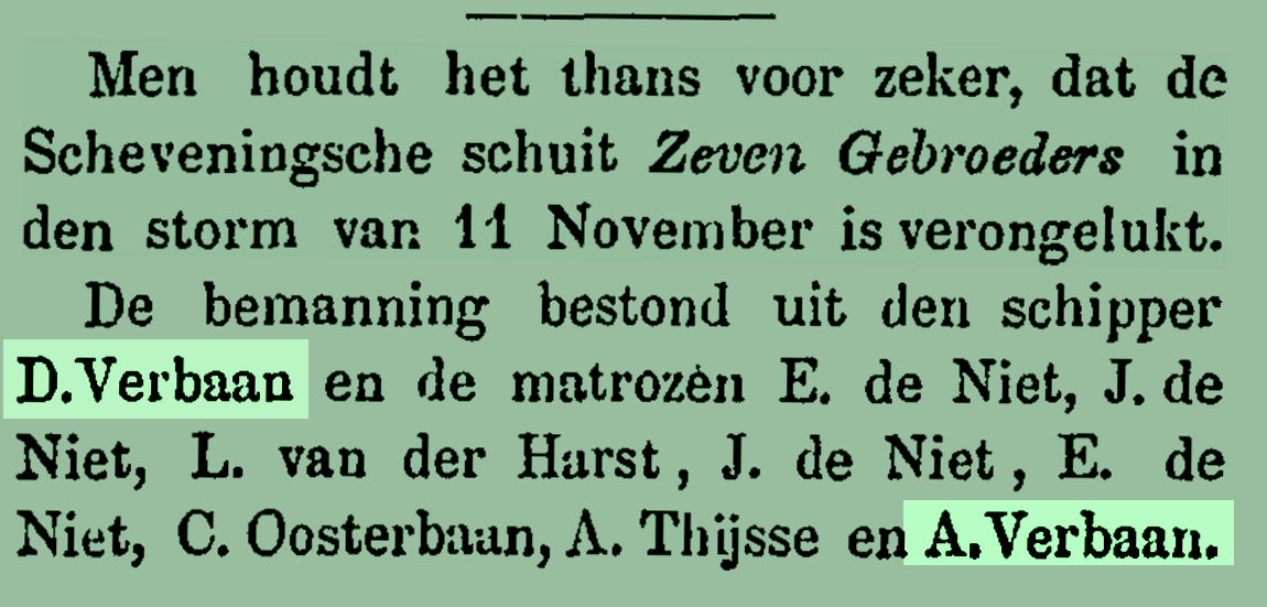 Daniël- en Arie Verbaan zijn vader en zoon. De broer van Daniël, Johannes Huibert- verdronk in september 1901 bij het aan boord gaan van de bomschuit SCH 278 'Alice' in de haven van Vlaardingen.