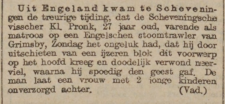 Op een trawler uit het Britse Grimsby raakte door het los- of uitschieten van een ijzer blok de 27-jarige Scheveninger Klaar Pronk zodanig gewond dat hij daaraan overleed.