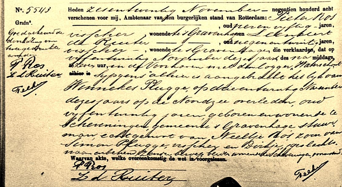 Stormweer op de 23e november deed niet alleen veel loggers van zee terugkeren door geleden vleetschade maar een tweetal schepen moest naar huis om een dodelijk gewonde bemanningslid aan wal te brengen. Op de logger was de stuurman Minnekus Plugge door een stortzee tegen de mast aangeslagen. Binnen 20 minuten overleed Plugge aan zijn verwondingen. De logger liep de 25e november Delfshaven binnen waar aangifte werd gedaan waarna het lichaam naar Scheveningen werd vervoerd.