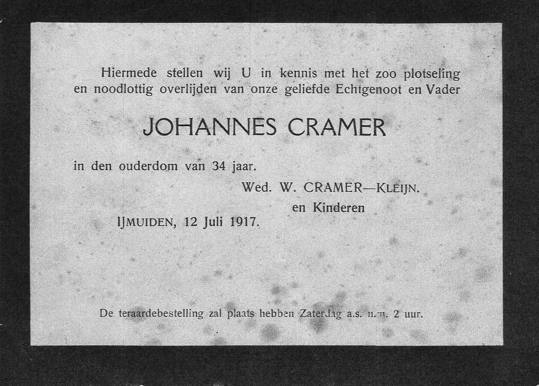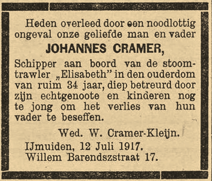 Johannes Cramer: was in 1914 met zijn gezin naar IJmuiden (gemeente Velsen)verhuisd. Zijn lichaam werd door de stoomtrawler IJM 266 'Petrus Paulus' te IJmuiden aan wal gebracht.