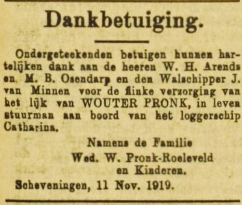 Op 6 november liep de logger IJmuiden binnen met aan boord het dode lichaam van stuurman Wouter Pronk. De visser had met kracht het einde van de reep tegen zijn hoofd gekregen waaraan hij overleed