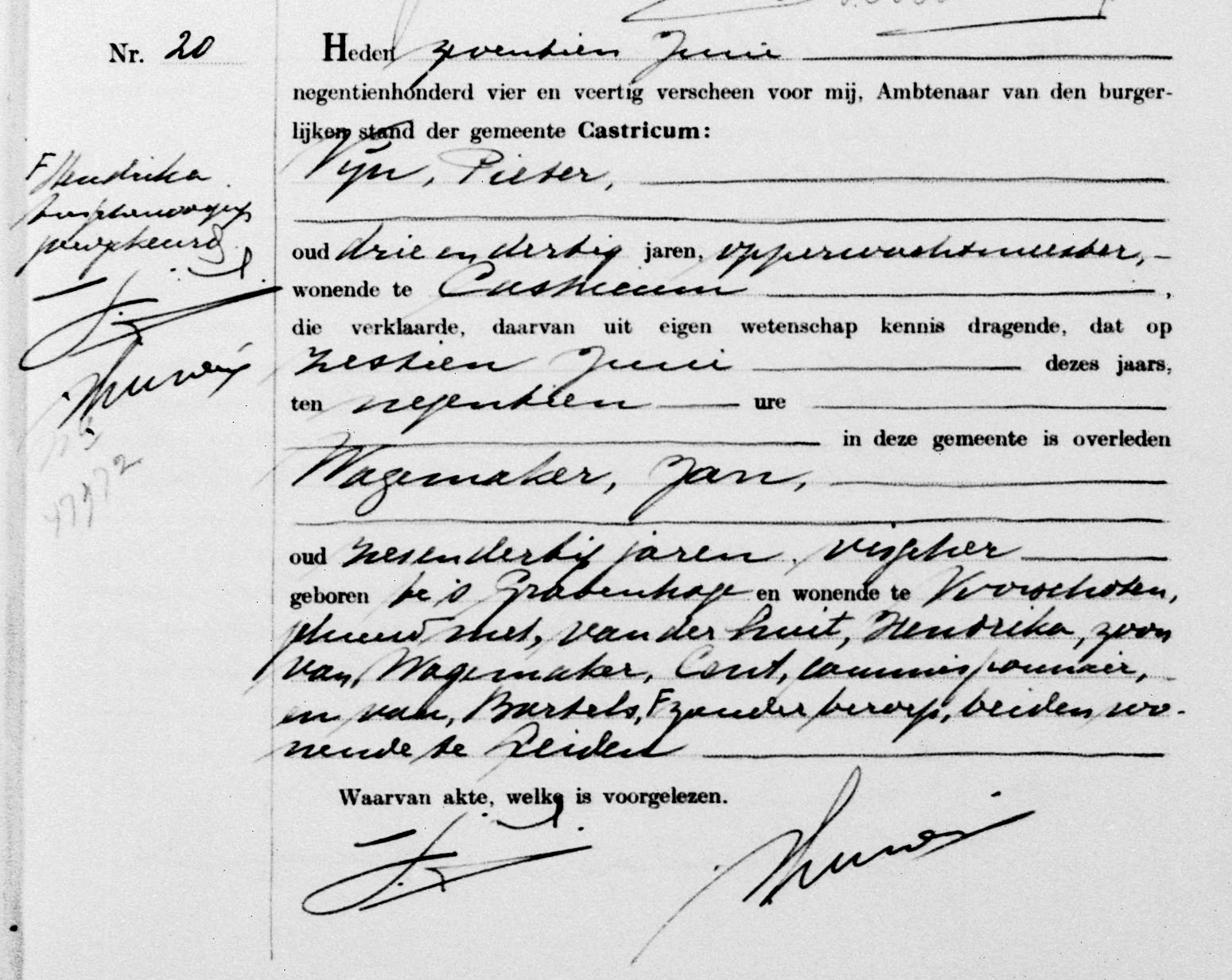 Jan Wagemaker spoelde op 16 juni op het strand van Castricum aan en werd op 20 juni te Voorschoten begraven.