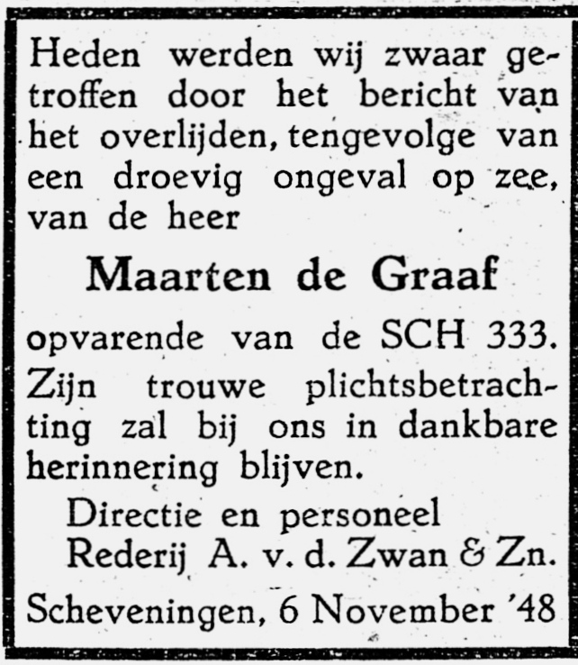 Op de thuisreis –met slecht weer- verrichtte matroos Maarten de Graaf enkele werkzaamheden aan dek. Hij sloeg daarbij overboord, bleef nog enige momenten aan het potdeksel hangen, waarna hij moest loslaten en daarna niet meer werd gevonden.