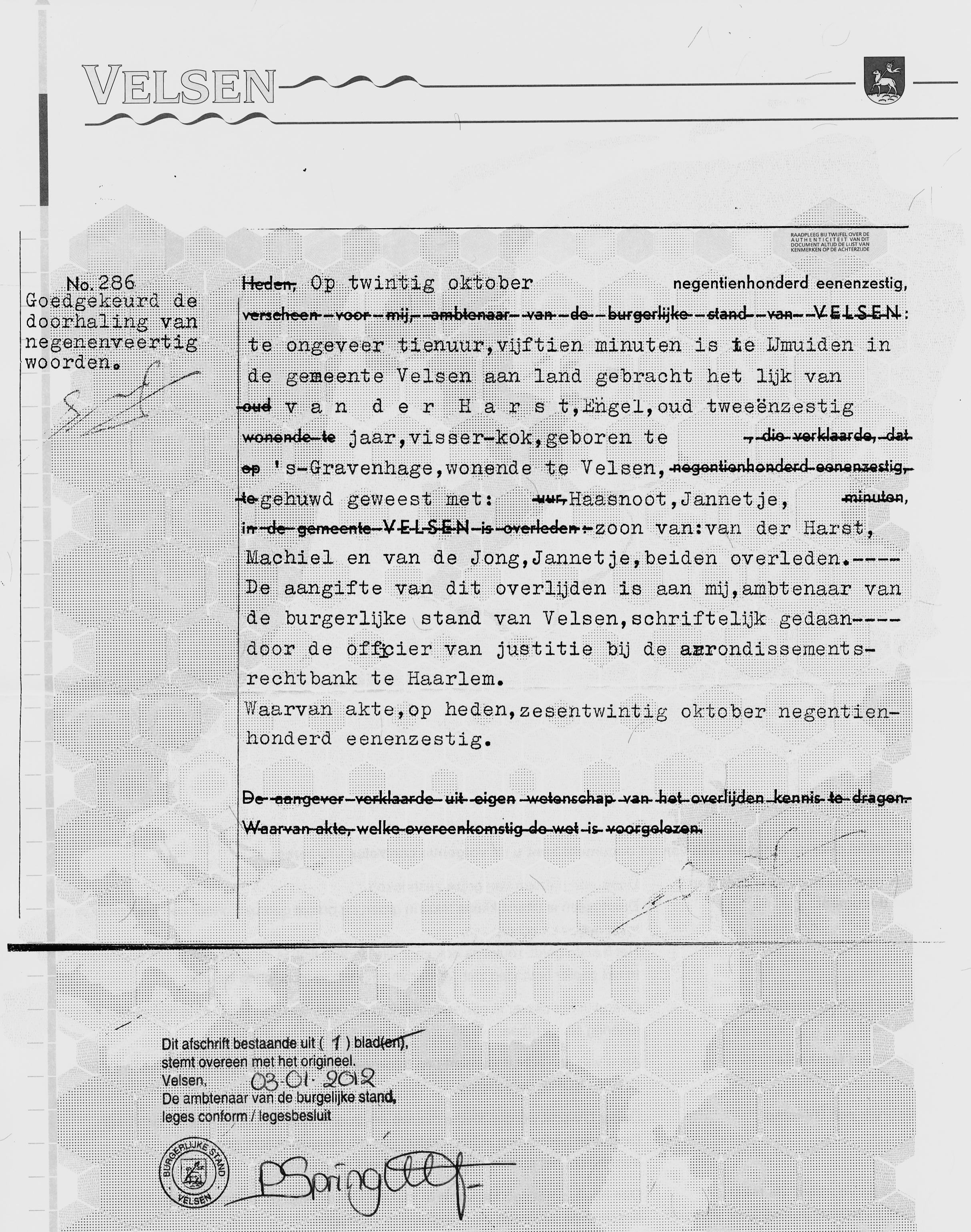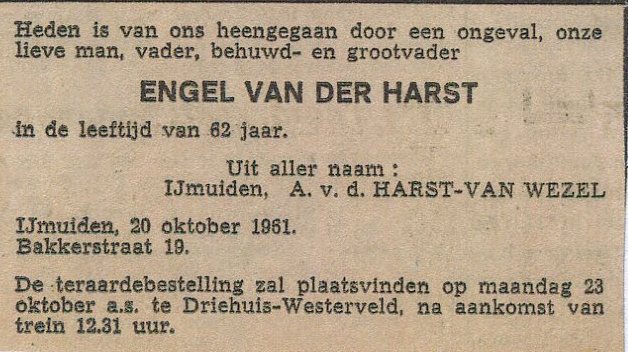 Engel van der Harst was - als tweelingbroer met Ment Cornelis- in 1898 te Scheveningen geboren. Later kwam het gezin in Katwijk en IJmuiden terecht.