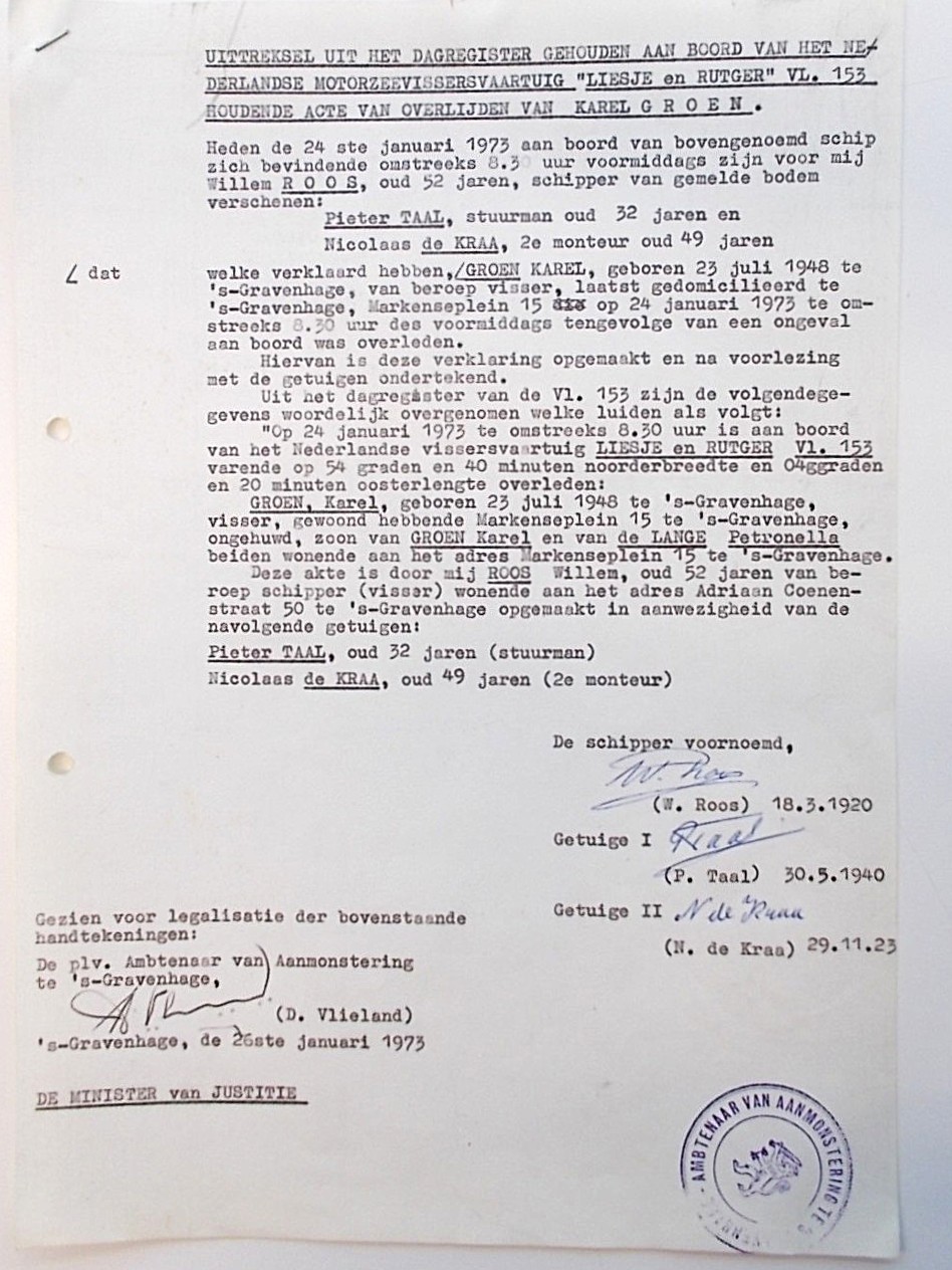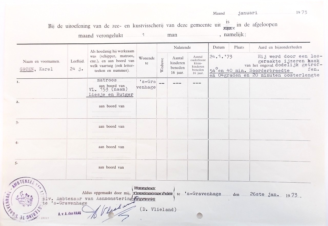 Tijdens het aanwinden van de vislijnen met de messinghaak brak deze. Karel Groen raakte daarbij dodelijk gewond.